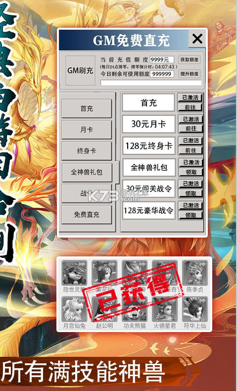 ★上线送GM直充工具,500充值额度,直接激活首充、月卡、至尊卡、战令等活动,闯关拿到800额度可以买全神兽礼包,拿所有满技能神兽。