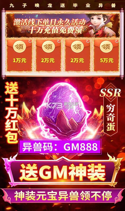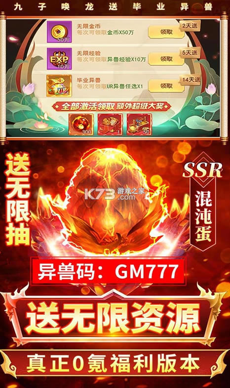 ★后缀说明:连续登录即送无限资源,毕业异兽!周卡、月卡、基金、终生卡等超值直购免费天数领取;升级更送十万红包、闯关送999异兽蛋、每日送BUG百连抽,在线送GM神装和千元红包,七天更送一套超强阵容异兽!