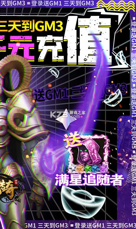 ★后缀说明:游戏内在线即可领取充值卡,每2分钟领取一次,共计可领千元充值卡,此为送千充;登录1天送GM1,登录2天送GM2,登录3天送GM3,此为送GM。