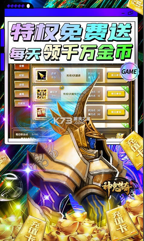 《神鬼传奇》天天领千万金币,登录就送一路相伴风雨无阻,天天激活就领gm3完成每日的活动,送千元充值福利超级多,各种玩法等你来探索,全自动化的pk对决,炫酷的3d效果带来华丽的视觉盛宴,沉浸式的仙魔世界各种神兵利器由你选择。