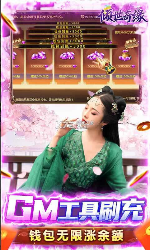 《倾世奇缘》拥有超多的福利,包含了送满级vip和gm商城和现金宝库和百万现金,无尽资源福利全白拿,领百万真充,开放唯美的仙侠世界,体验土豪的快感,欧皇免费抽,上线升级在线签到统统都有的送。