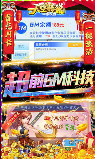 《天空传说(GM无限刷充)》是一款全新的国风回合制手游,上线就送 VIP9+100w元宝+1000W金币+GM修改器特权,每天打材料副本掉落海量真充卡碎片,可兑换海量充值!