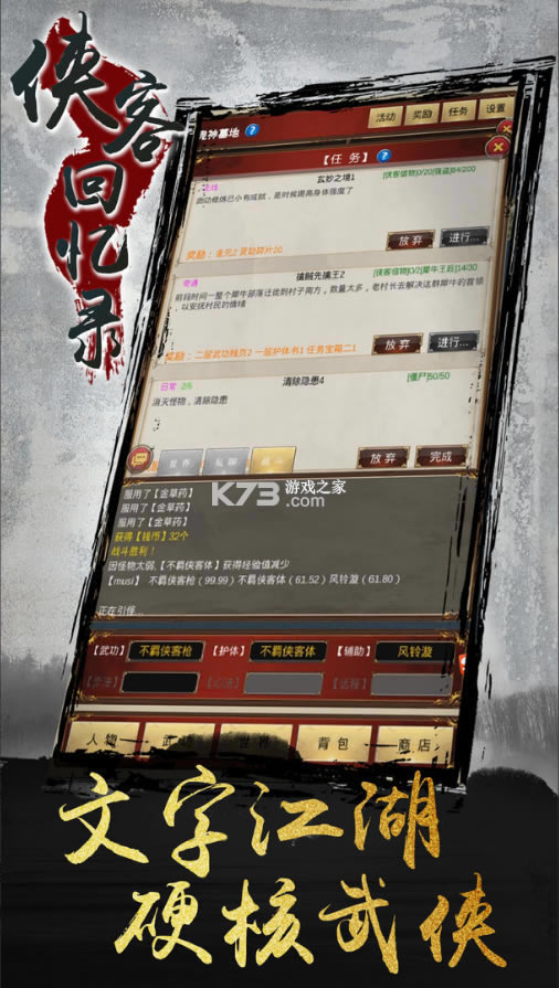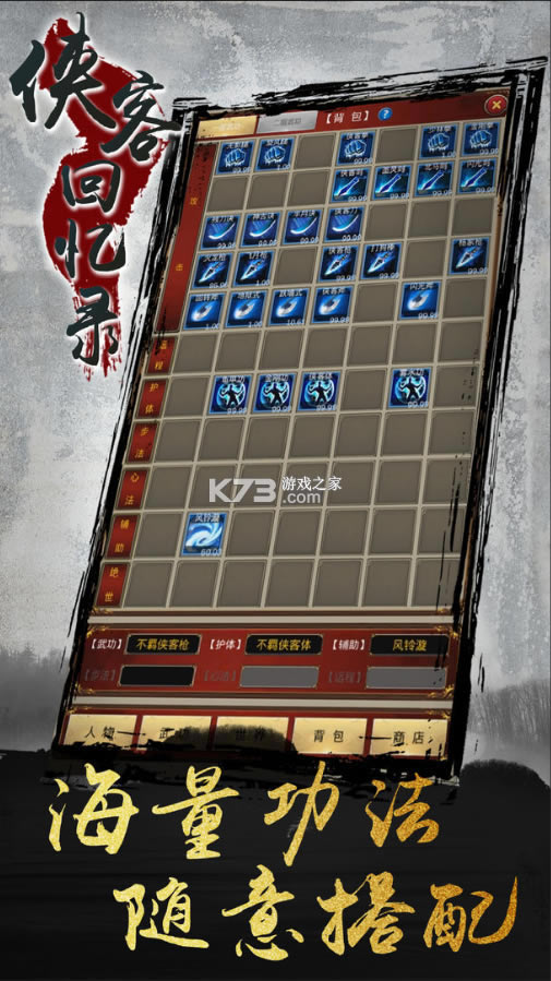 《侠客回忆录》是一款玩法非常复古的武侠类手游,游戏中用简单的方式为玩家们描绘了一个生动形象的武侠世界,游戏的玩法非常的自由,各种各样的武学秘籍可供玩家们进行学习,赶紧下载游戏体验吧。