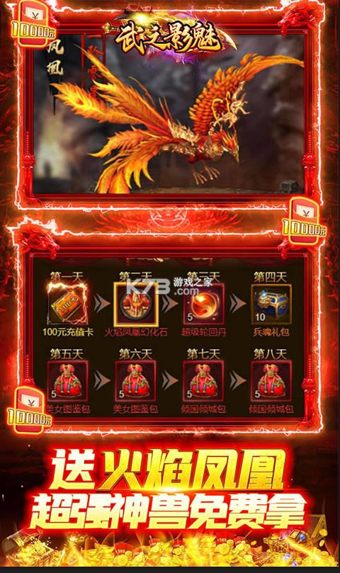 预约礼包:元宝*20000、橙色图鉴包·传奇盛世*1、热血碎片*30、战灵进阶丹*100
