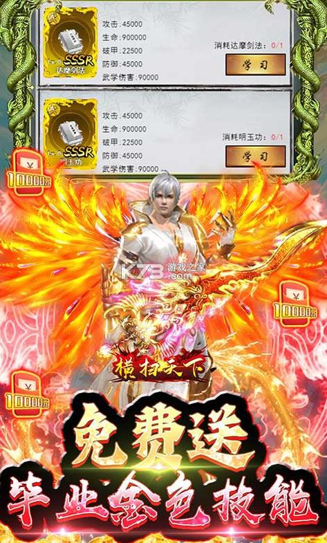 ★上线即得元宝*98888、铜钱188W、满SVIP30、GM红装套宝箱、武学大礼包!