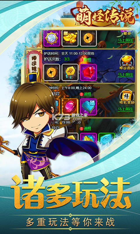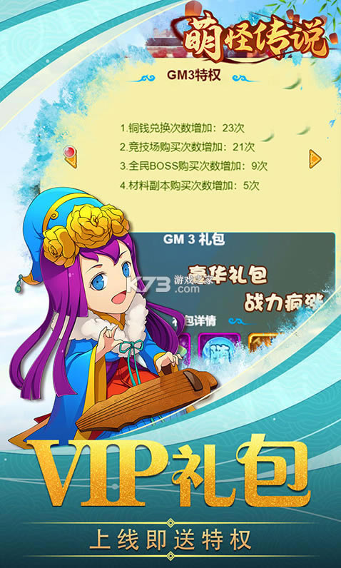 《萌怪传说》连续登陆高阶道具等你来拿,每日签到领取元宝好礼,首冲送豪礼最高可领强将,诸多玩法多样玩法等你来战,上线就送特权,增加了GM商城,收服更多的武将攻略城池,挑战关卡送关羽,福利超级多乐趣无限。
