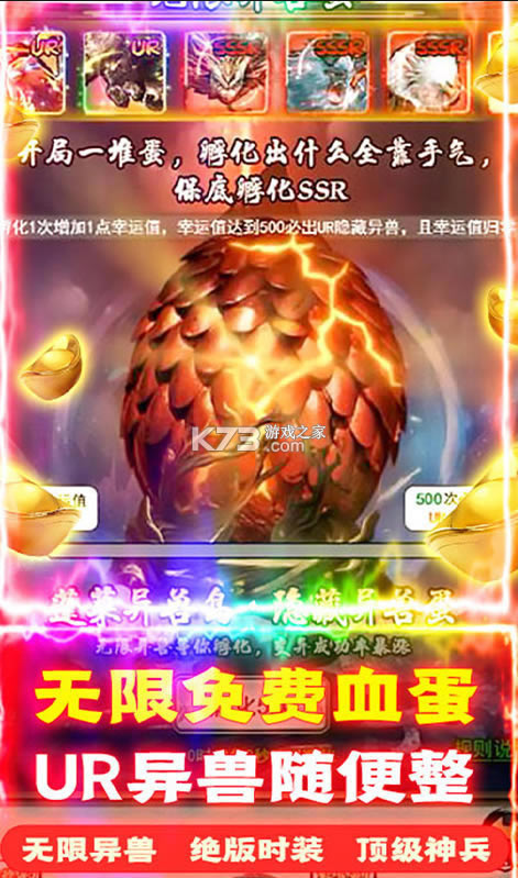 有击杀BOSS、通关副本、势力争夺、三族争霸等丰富多样的玩法,享受万人PK竞技福利功能一步到位,真充卡送不停,送极品异兽、绝版伙伴、绝版神兵、零氪畅玩、纵横三界,更有无限异兽等你孵化!为人族在上古世界中的生存权利而与妖魔抗争。