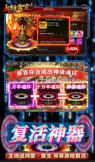 《永恒雷霆》上线送钻石20万,元宝1亿,战狂★魂环特权,创号免费领取,炫酷魂环外观。主线一点秒升百级,一款独创1秒99刀,无限攻速,百倍爆率,所有装备,所有特殊装备以及材料游戏内全部能爆。