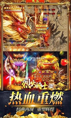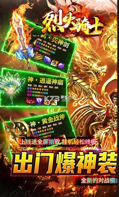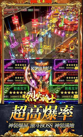 《烈火骑士》出门爆神装,全图都横着走,超高的爆率海量的福利,开启热血重燃,经典的特色单职业的传奇游戏,不肝不氪高爆率解锁游戏道具,爆取极品的装备,全新的对战模式,无限制刷怪乐趣无限。
