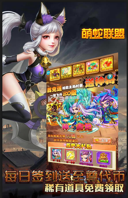 《萌蛇联盟》全新西游卡牌的巨作,独具东方神韵的时尚画风,上线豪礼多多私人定制的称号,上阵卡牌无门槛送神卡,不花钱也能玩,福利超级多,白拿元宝核心道具送送送,首充双倍元宝,副本掉真充,快速的来行动吧。