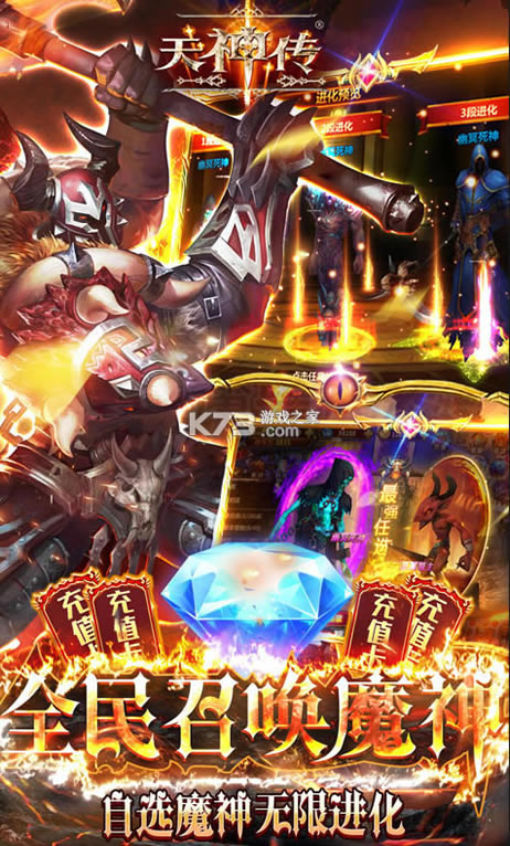 《天神传-百万破坏神》暗黑魔幻手游,开局送魔神,游戏创新奇遇交互玩法,江湖成长触发惊喜。游戏涵盖了多种精彩玩法,即时战斗自由操控,创新多套技能系统,主题时装极致诱惑,团队征战副本,野外boss激烈厮杀,热血帮派,江湖奇遇!十大广袤野外引人入胜,二十余秘境光怪陆离!沉浸式主线剧情,重新诠释大世界。