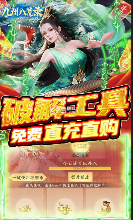 百万玩家都在玩的国风仙侠手游《九州八荒录》福利版现已全新上线,来玩就送破解工具,挂机获得破解币可替代RMB到指定充值界面进行充值和购买礼包!暴爽养龙寺副本必爆直充卡,刷到满阶金龙战力狂飙!