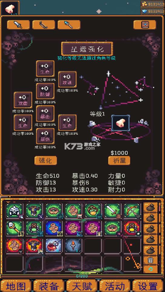 4、游戏内容结合了地下城rpg、塔防等等元素,你可以无限探索这个场景,通过杀死敌人获得新的技能和属性,解锁更多的装备