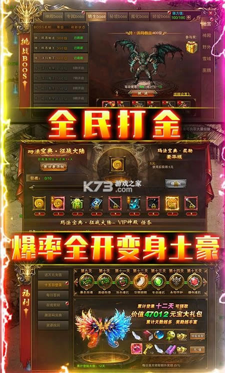 丰富多样的刷BOSS玩法,玩家可以体验游戏的快感游戏传承了经典RPG的自由PK、BOSS战、高概率掉宝等特点。