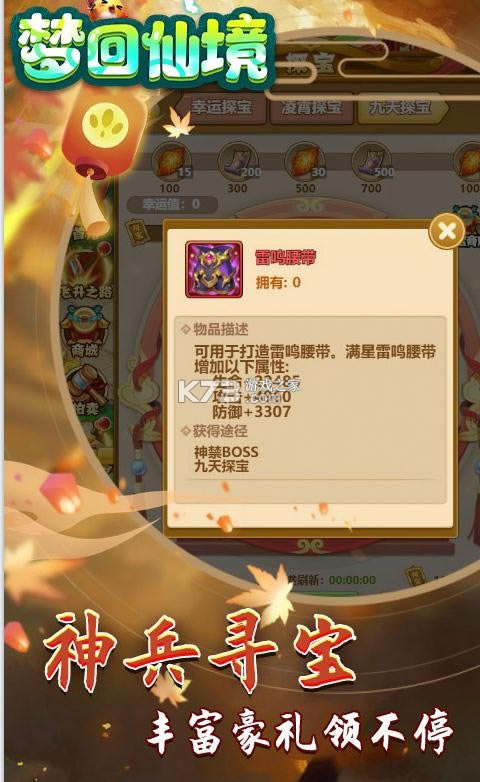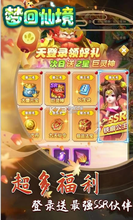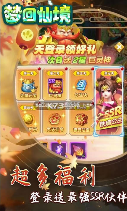 《梦回仙境》西游神话气息的游戏画面,唯美的外观系统,还拥有仙侣和法宝宠物等,上线首充送5倍的充值,充值比例高,超多福利登录就送SSR伙伴,超强合体融合,一键打造最强的神装丰富豪礼不断福利领不停。