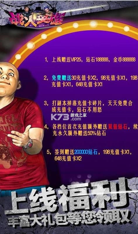 《战火英雄-送千元充值》本游戏上线赠送VIP25,钻石188888,金币888888,打副本掉落充值卡碎片,天天免费合成充值卡,钻石不用愁,签到再赠送200000钻石,198充值卡*1,648充值卡*2