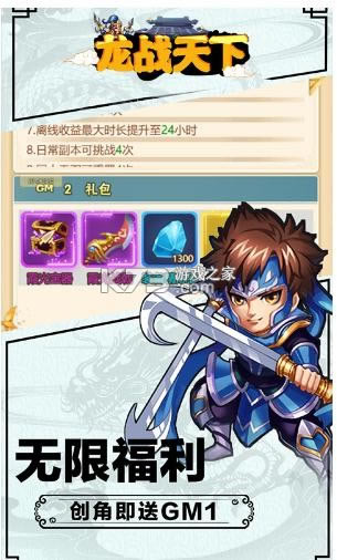 《龙战天下》招募三国名将共同去征战沙场,攻略城池,上线即可送福利,送千元充值卡和千元元宝卡,上线即可送无限福利每日领,无限商城购买仅仅只需要1元宝,各种招式超炫酷的神装,自由的搭配创新招。