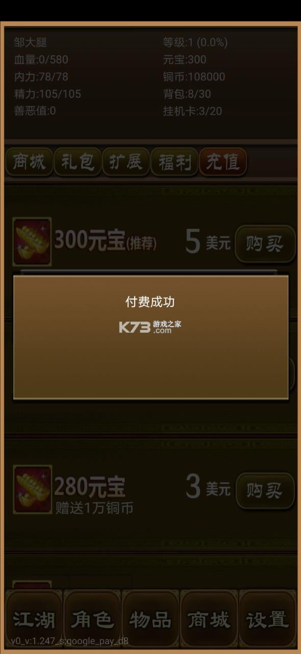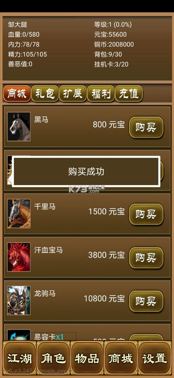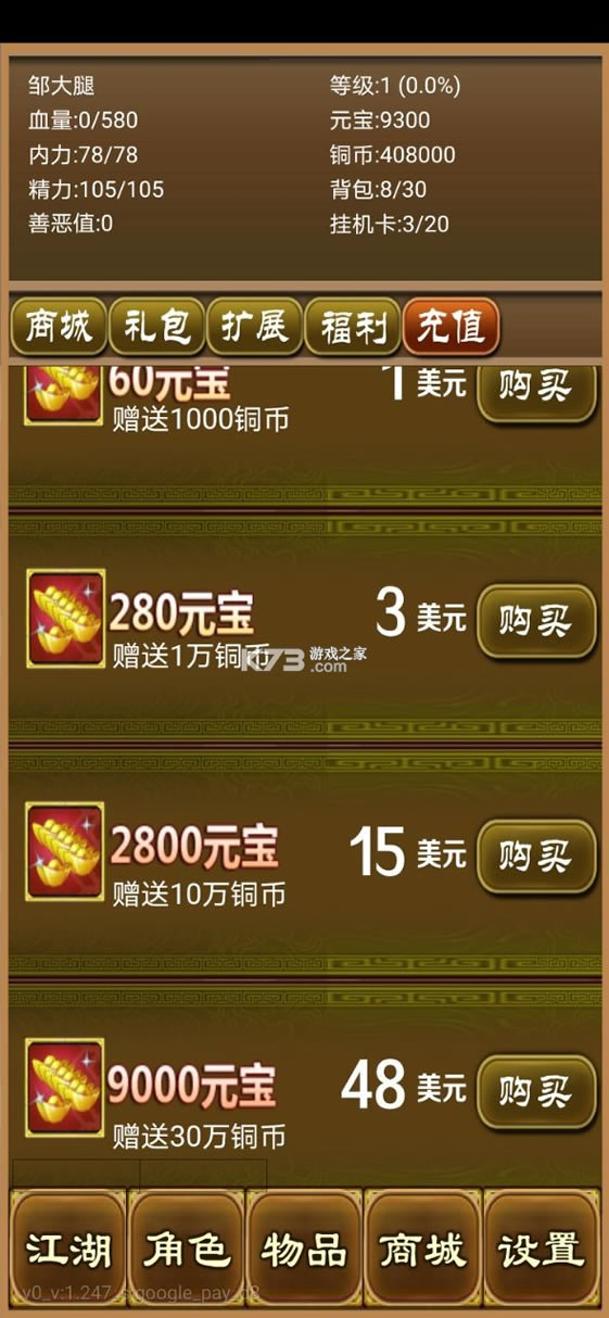 破解内容:无限购买元宝使用元宝,无限买材料。(进入商城,点击充值,直接购买元宝,可以无限制购买元宝。)