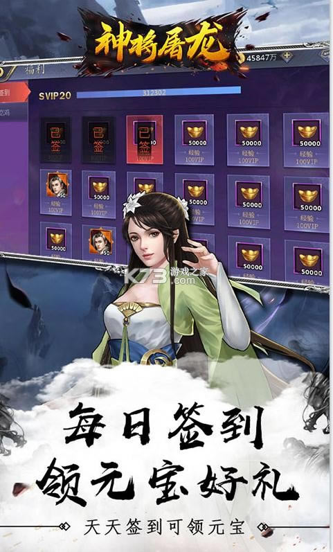 《神将屠龙》汇聚了超多的玩法,保证玩家们爱不释手,上线就送侠客和大量的元宝,超v福利奖励拿到手软,完善的系统体验纵横的江湖世界,刀光血影的武林,从此让你走向人生的巅峰,七大福利多多帮助你闯荡江湖,天天拿高阶道具和元宝。