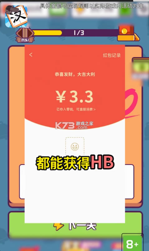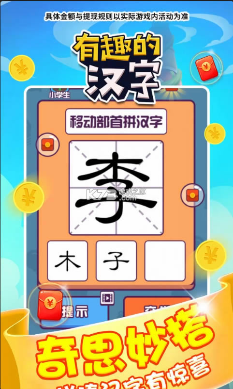 有趣的汉字红包版是一款轻松有趣的闯关游戏,我们中国文字博大精深,在这款汉字大英雄游戏中我们通过抒写汉字来闯关,有的还需要进行猜字等等,在有趣的汉字红包版后面的一些关卡会有难度,有的字我们甚至从来没有见过,完成任务还能够获得现金奖励,因此这款有趣的汉字游戏能够让我们学习汉字的同时赚钱。