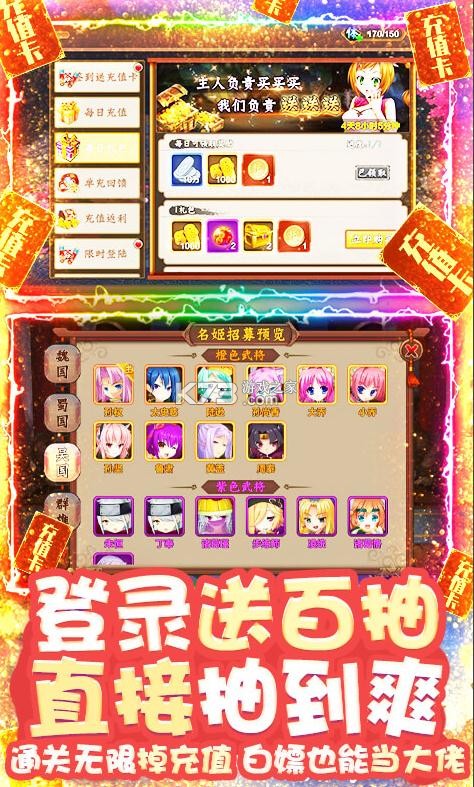 《恋三国》在这里无需充值免费当托的游戏,登录就送百抽,提升游戏的战力,升级领豪礼,送绝版的游戏称号,注册角色就送,还是那个我们所熟悉的味道,可爱的萌少女们,带来不一样的体验感,开启梦幻的恋爱。