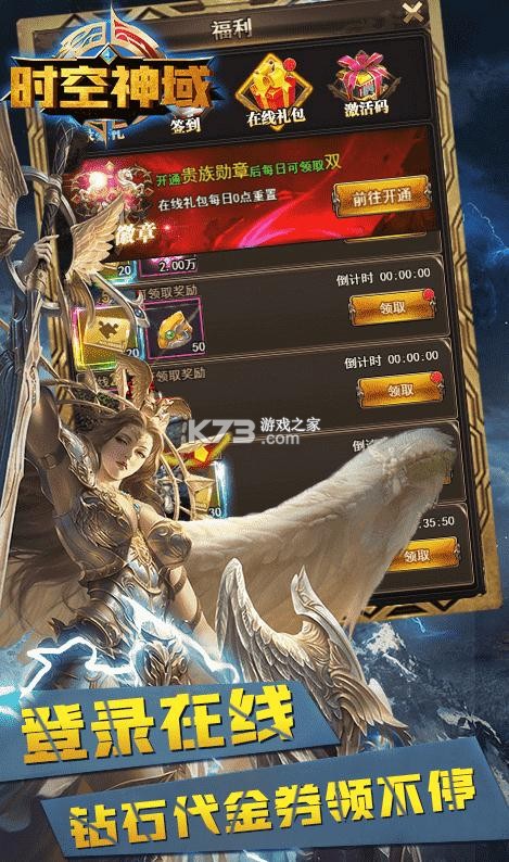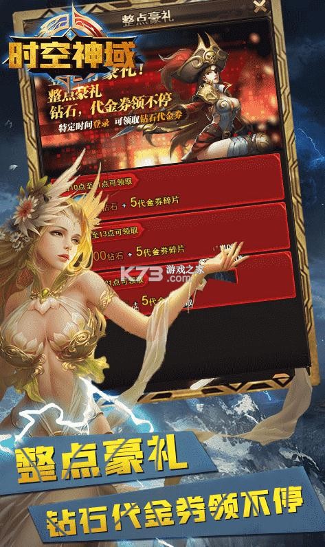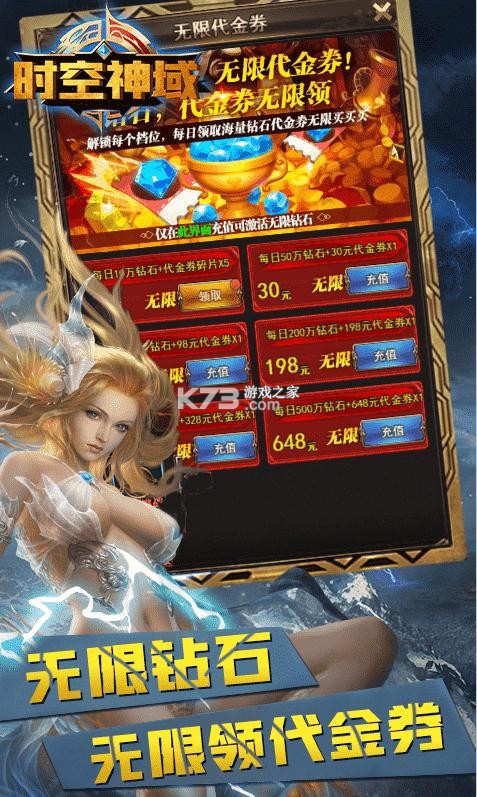 《时空神域》领取海量的游戏钻石,上线即可送GM商城福利多,无限领代金券,在线登录豪礼领不停,1元钻石永久购,各种女神宝物和稀有道具超丰富,登录签到免费领取代金券,轻松变土豪,在这里玩就送送送,一起来加入游戏吧。