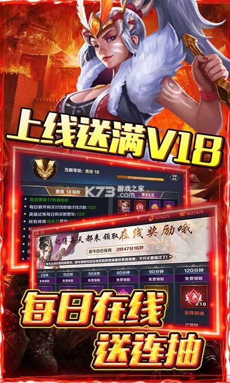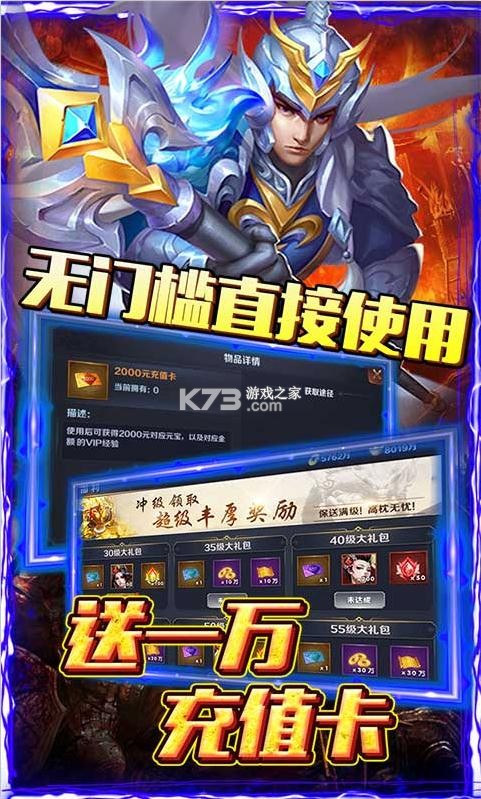 ★后缀说明:送万元充值活动,升级就可领取总值超1万元的充值卡,还有各种传说金将,至尊红将,海量珍贵道具免费送,江山美人我都有
