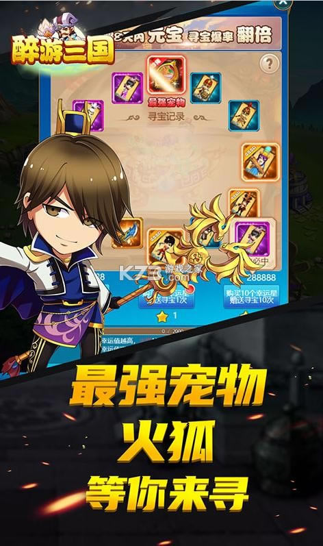 醉游三国是一款以三国为主题,结合中国传统神话故事创作的挂机类回合手游,在游戏中玩家将扮演一名主公,收服武将,培养上古神兽,攻城略地,制霸神话三国世界