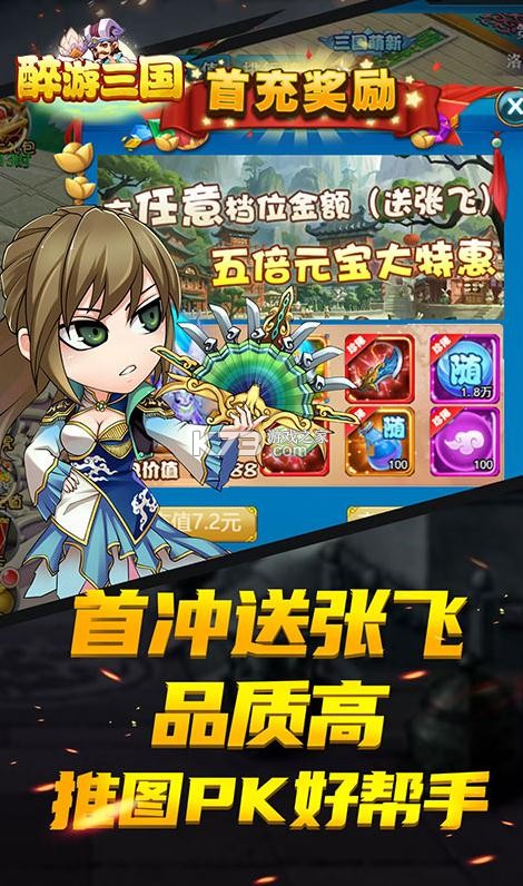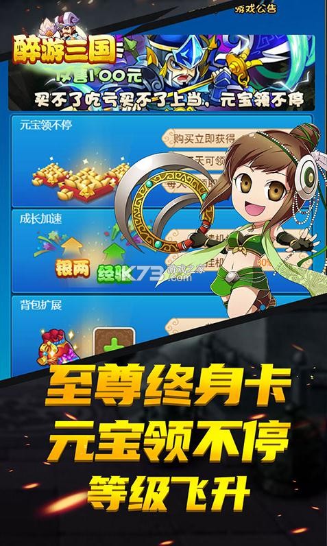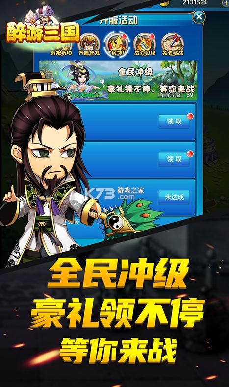 《醉游三国》升级送奖励,多样的模式,结合了传统的挂机的模式,培养武将,制霸三国的神话,每个角色都有3到4个主动和被动技能,欢迎来到最具有创意的三国世界,在这里顶级的视觉体验,让你超爽感,看大片一样。