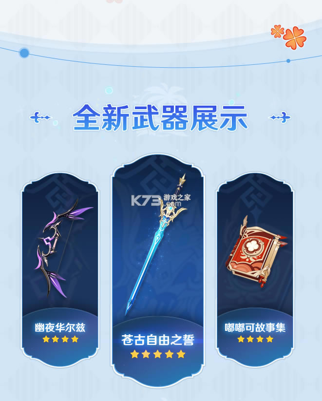 武器上新一共三款,分别是「千年大乐章」系列的新成员——「苍古自由之誓」,版本活动主题的四星武器「嘟嘟可故事集」,以及目前比较神秘的、看起来是菲谢尔专属的「幽夜华尔兹」。