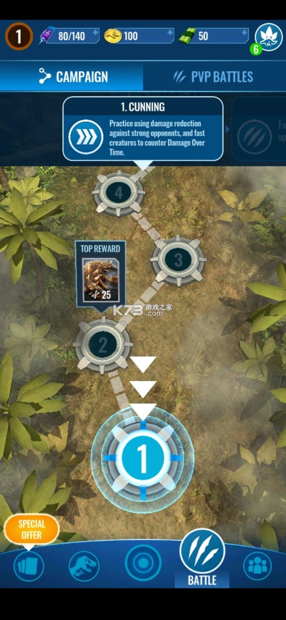 4、当玩家的等级达到5级后,除却正常关卡挑战外玩家还可以进行竞技场战斗的挑战。每次挑战仅仅花费少量钞票,即可开启一场一本万利的竞技场挑战之旅。而玩家战胜敌人后就将获得金币、食物、基因链、钞票等珍贵资源,更有可能获得最高价值328元的传奇级卡包。所谓一本万利!对自己战斗技巧具有信心的同学一定要尝试一下。在挑战过程中一定要注意不同系恐龙之间的搭配,才能更轻易战胜对手。