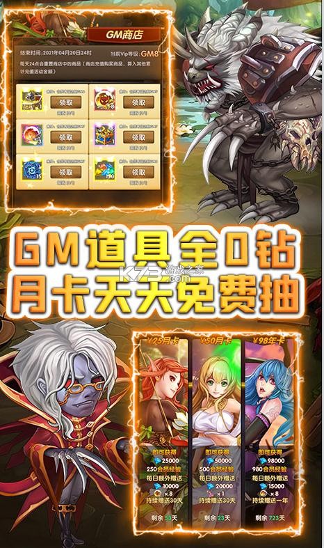 ★开局GM1,88888钻,金币1亿!七日登录首日送100W,上线0氪约120W钻!