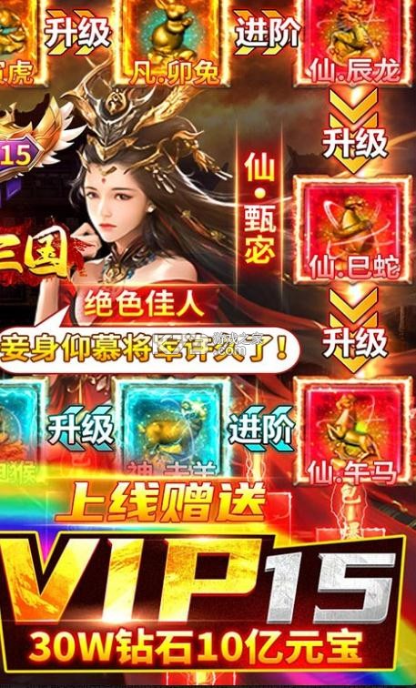如果你对这样一款游戏感兴趣的话,最炫酷绝招发挥于手指之间,满屏特效技能让你头晕目眩!还有更多福利助你驰骋三国上线赠送VIP15,30W钻石,10亿元宝,轻松的挂机战斗,让你横扫千军荡平三国