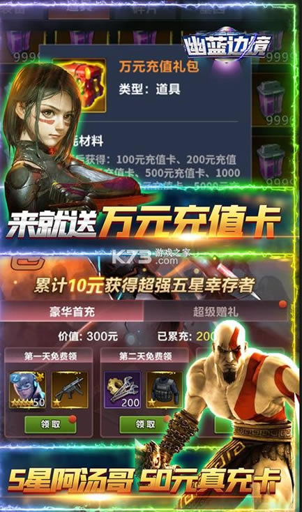 超爽末日题材放置卡牌手游-幽蓝边境(GM免费版)震撼来袭!本次版本新增真充卡,不但能免费开启全部GM商城,还可激活豪华首充、超值赠礼、每日特惠、限时累充、天天壕礼等多个充值活动!来玩就送万元充值卡、5星阿汤哥!永久500抽,神将神装各种有!1元既得700倍暴爽返利!签到天天领钻石,神级红装天天送!创角即送V14、钻石128888、金币1888W、50元真充卡,让你前期毫无压力!充值比例1:1000,各档首充得双倍!