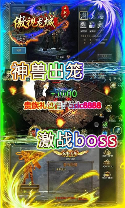 自由战斗,万人同屏热血PK!掉装备!可交易!快速冲级抢神装,百种世界BOSS,掉落万种神装,自由组合,神装在手,狂虐BOSS!