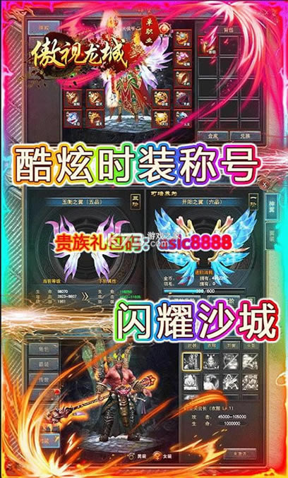 战力拼杀抢称号,荣耀加身全服独享!千种时装造型,个性形象应有尽有,神级坐骑,大天使之翼,打造属于你的专属风格!