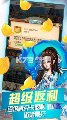 这是一款超轻松放置武侠手游,上线送50万元宝、1000元充值卡、1000万金币;绝无仅有的十万充值卡福利,海量元宝全民立享;独家无限资源赠送系统,所有无限特权直接相赠,每天免费领充值卡、万能碎片等稀有道具!超级返利,百倍真充卡返还,使用后激活永久累充活动!无限货币,激活立享豪华返利,每日最多6000万元宝返还!