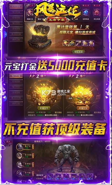 《风爆远征王者争霸》满屏福利上线送充值卡,超高的爆率和超高的收益,不充值也能获得顶级的装备,送vip积分直接激活,超多元宝免费领,延续传奇的画风,热血复古的游戏气息,构建一个气势磅礴的世界,超多选择,不同的体验。