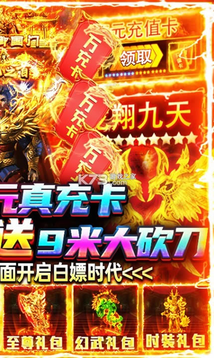 ★上线即送永久时装,1亿金币,充值卡拿到手软。高级装备全靠送,战力水涨船高。