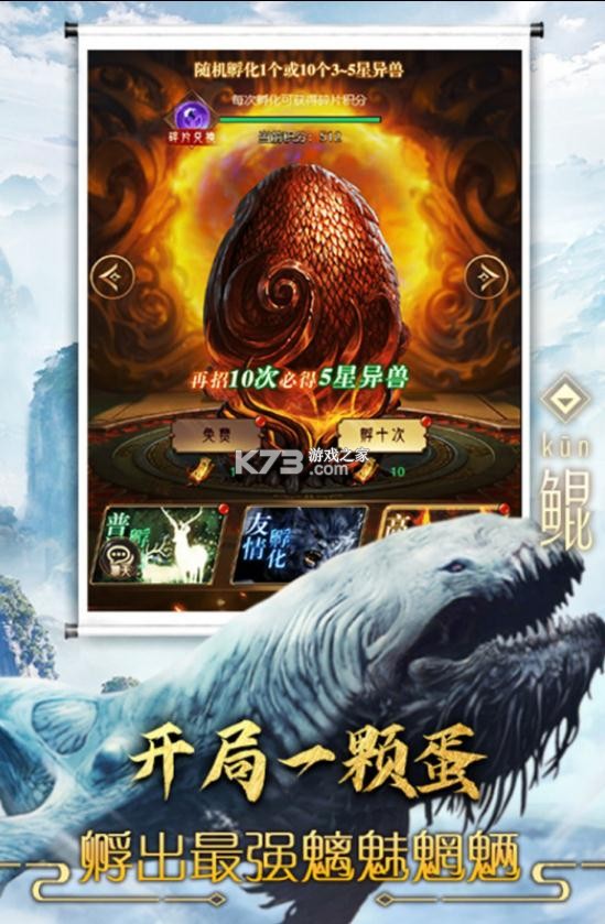 开局一颗蛋,孵出异兽千千万。游戏全新异兽玩法及养成系统,数十种异兽随你挑选,高自由度异兽养成系统,吞噬进阶,元神培养等,让你成为最强大的“驯兽师”。