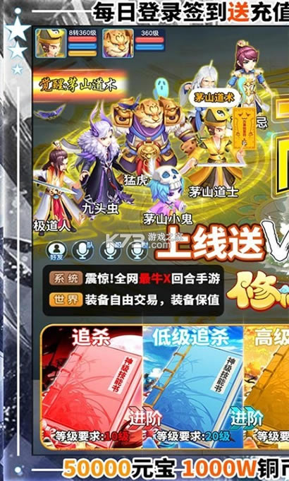 《修仙物语-每日送充值》上线送VIP10,50000元宝,1000W铜币,抽奖卷*30,白龙马*1,每日登录签到送充值卡,至少10元充值卡,全新玩法,上百种技能书,近千种心法搭配,无限打书全红,打书炼妖两不误!