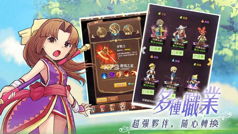 可攻可守的剑士、群攻爆炸的法师、战力爆棚的斧战士,超强战斗力任你切换。除此之外,更有樵夫、矿工、炼金术士等等副业选择。无论是向往热血的战斗,还是休闲的生活,这里都能满足你!