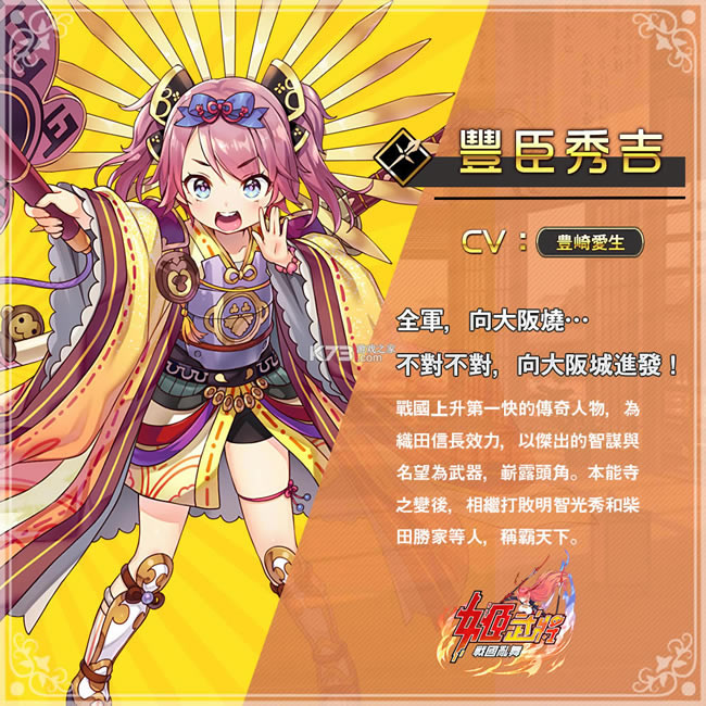 「姬武将:战国乱舞」是战国策略型手机游戏,通过二次元的美少女角色设计与战国时期宏大的战斗场景的结合,实现了全新的世界观。觉醒者聚集并培育了众多战国少女,带领手下的大军参加城战在乱世中扩展自己的势力。官方宣布,今日将公开情报,释出声优阵容及城战玩法。