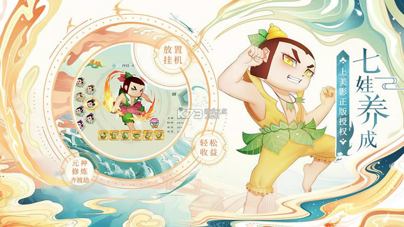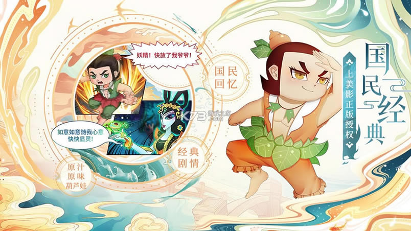 《葫芦娃各显神通》是一款国风手绘风格的休闲放置手游,由上海美术电影制片厂正版授权,极致还原动画片《葫芦兄弟》原作剧情及设定,同时融入符合东方美学特色的国风手绘风格,力求复刻8090年代的国民记忆,带给玩家们毫无杂质的童趣与纯粹快乐。