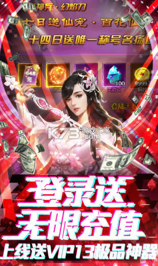创角就送VIP13,28888元宝,千万铜币,还有超萌仙宠、强力红武上线就能拿!