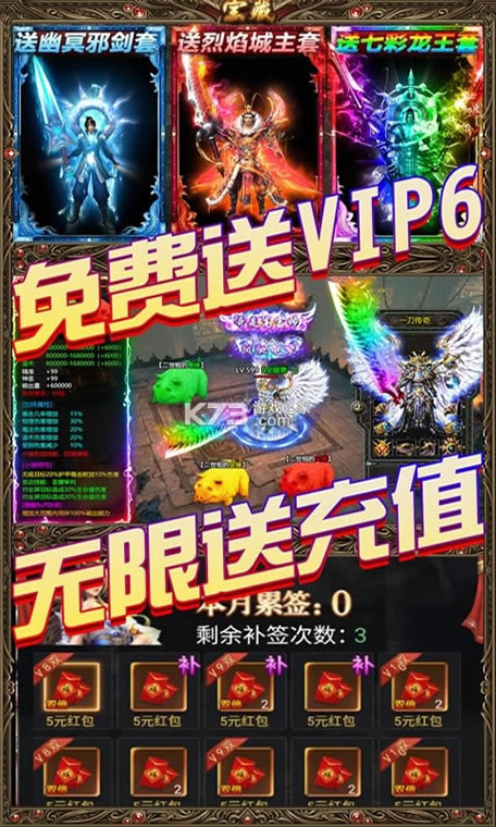 最最最重磅的是只需登录、活跃,我们就会免费赠送给我们所有的玩家充值卡!只要你敢来,我们就能把奖励送到你手软!快点下载游戏一起来找回属于我们记忆中的传奇!