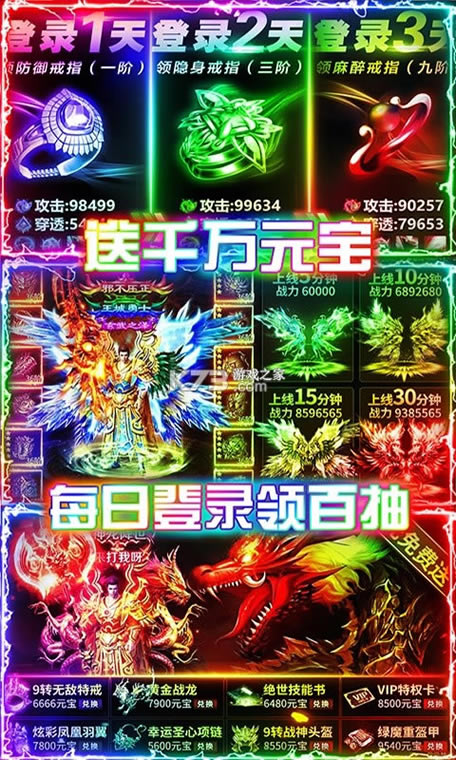 次日登录领198元充值卡,完成活跃天天领百连抽,无限寻宝抽充值,白嫖充值不是梦!天天充值领万元充值卡,首冲任意金额赠送四倍钻石,还有超强极品宠物等你领走!