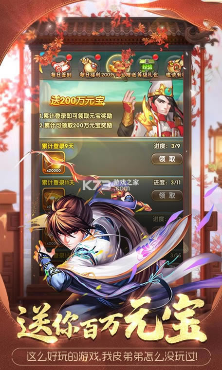 3、充值比例1:500、送百万元宝,登录累计免费领取200万元宝,等同实际充值4000元
