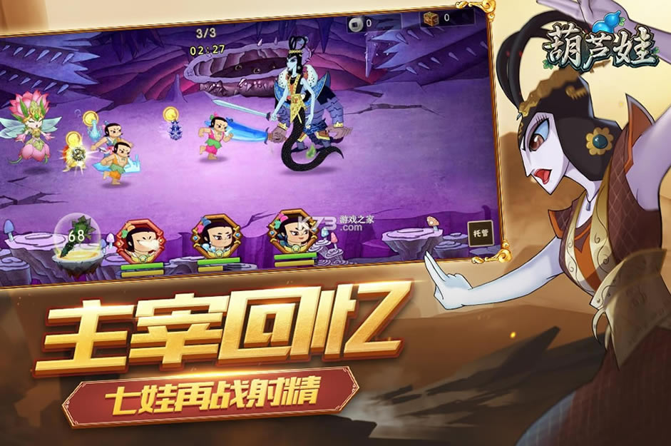 由上海美术电影制片厂正版授权,以86年《葫芦兄弟》剪纸动画片为背景的手游大作。深度还原动漫情节,开创横版战斗手游全新玩法,挥别传统AI组队、电脑控制,策略搭配,默契组合,与游戏好友实时互动,共闯妖巢!当年的你,只能看着电视屏幕暗自捉急,如今,你却可以带着团结勇敢的葫芦娃们,拼荆斩棘,怒破妖洞大门!此番能否救出热心善良的爷爷与凄凉悲苦的小蝴蝶,还看今朝掌中葫芦娃!《葫芦娃手机版》是这款经典游戏推出在手机上的破解版本,也是游戏的优秀手游改编作品,其将原动画的画面精髓完美还原到游戏中,各种葫芦娃兄弟的形象全部仿佛活了一下出现在游戏中,让你体验葫芦娃兄弟与蛇精们的爱恨情仇。《葫芦娃手机版》是游戏推出在手机上的官方版本,也是游戏的最新安装包,不需要额外的操作,你就可以享受这款游戏带给你的欢乐,与天天叫着爷爷的葫芦娃兄弟们一起,拯救被蛇精抓走了的爷爷。