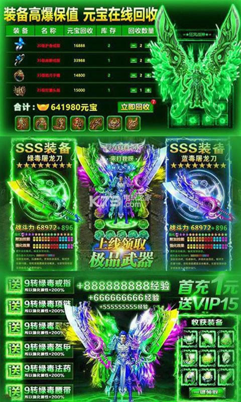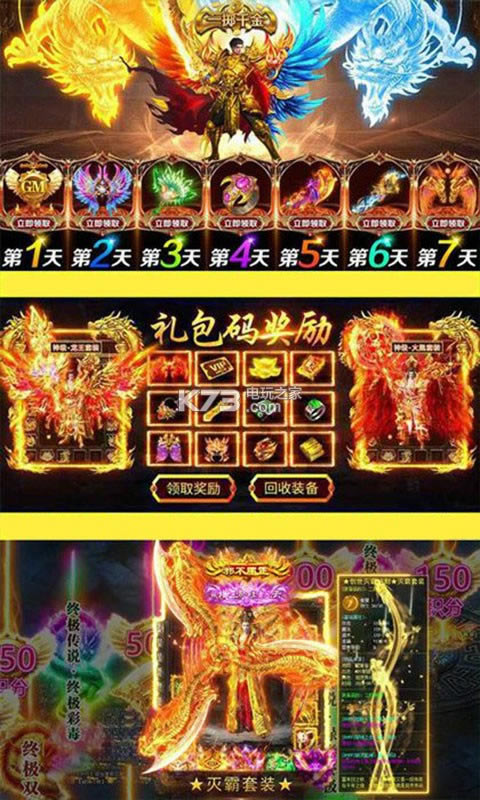 1、上线送满V(V20)、10W元宝、200W金币、皇家圣装*1